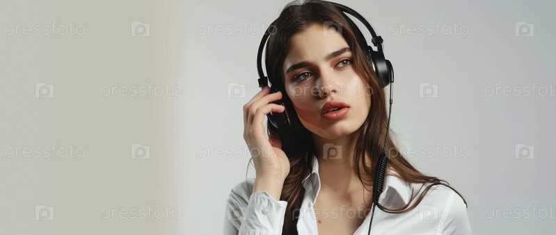 Сотрудник службы поддержки носит наушники и белую рубашку, предлагая профессиональную рабочую среду