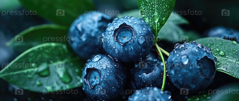 Свежие черники, покрытые капелькой росы на зеленых листьях