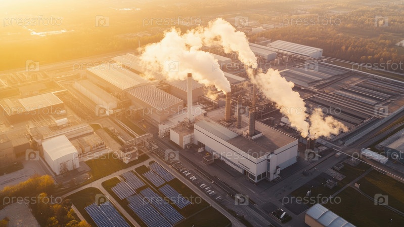 Этот взгляд с воздуха запечатлевает промышленную установку с выделяющими дым солнечными батареями под закатом