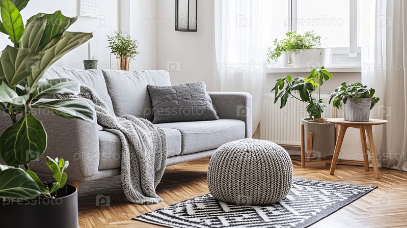 Уютная минималистическая гостиная с вязаным пуфом и зелеными штрихами