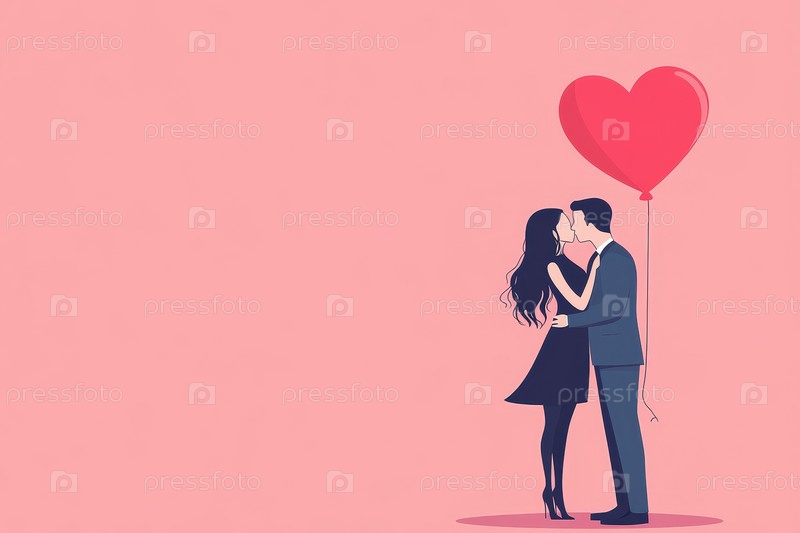 Пара делится нежным поцелуем, держа сердцеобразный шар на мягком розовом фоне