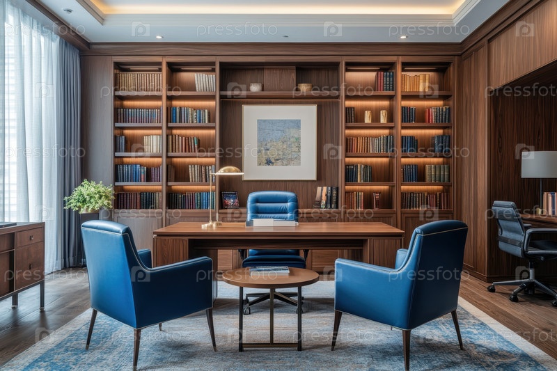 Элегантный офис с роскошными синими кожаными стульями и деревянной книжной полкой