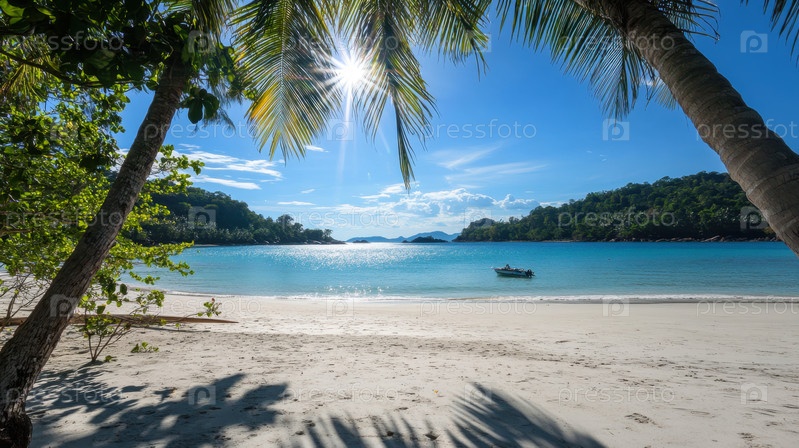Тропический пляж с пальмами и чистой голубой водой