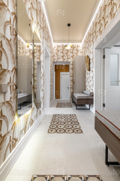 Элегантный интерьер прихожей с бежевыми рисунками обоев, геометрическими акцентами плитки, настенными скамейками и потолочным освещением в теплых тонах