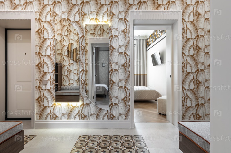 Стильный коридор с графической обои, геометрическим декором плитки и большим зеркалом, отражающим спальню с минималистичным интерьером