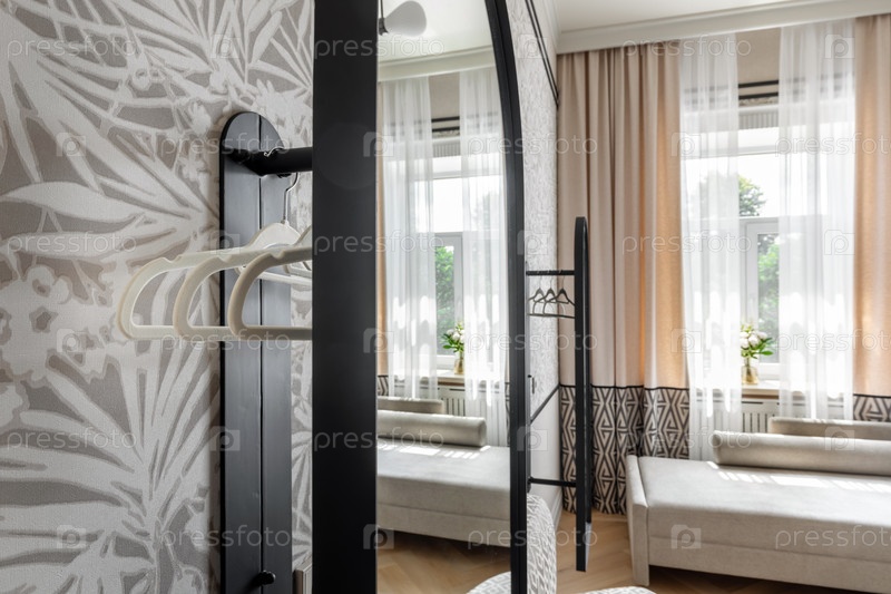 Зеркало отражает яркий, современный интерьер с бежевыми шторами, минималистическими вешалками и мягким естественным светом, заполняющим уютное пространство