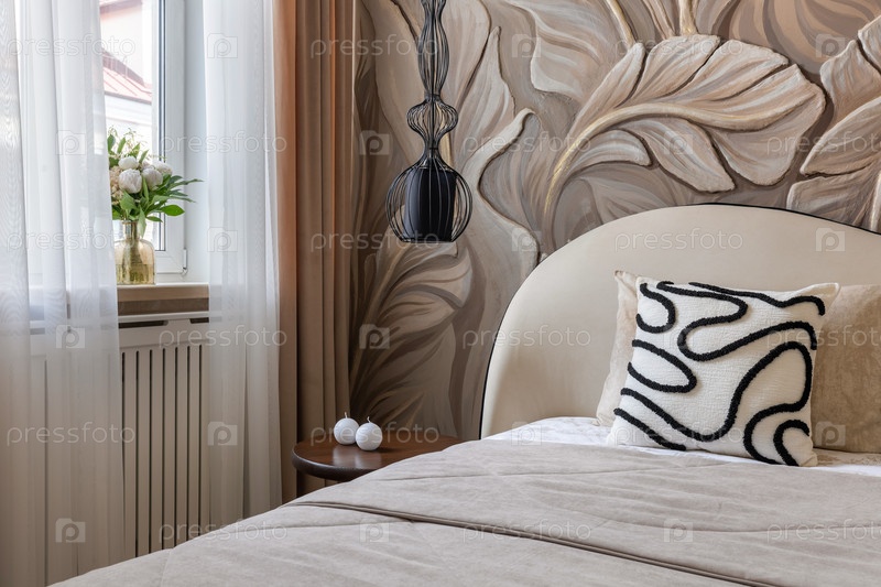 Близкая стильная спальня с текстурированным стеновым искусством, декоративная подушка, мягкое постельное белье, подвешенный свет и цветы на подоконнике