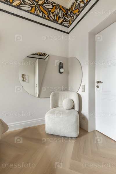 Современный минималистический уголок интерьера с мягким бежевым креслом, геометрическим зеркалом и декоративным украшением стен в жёлтом и черном цветах