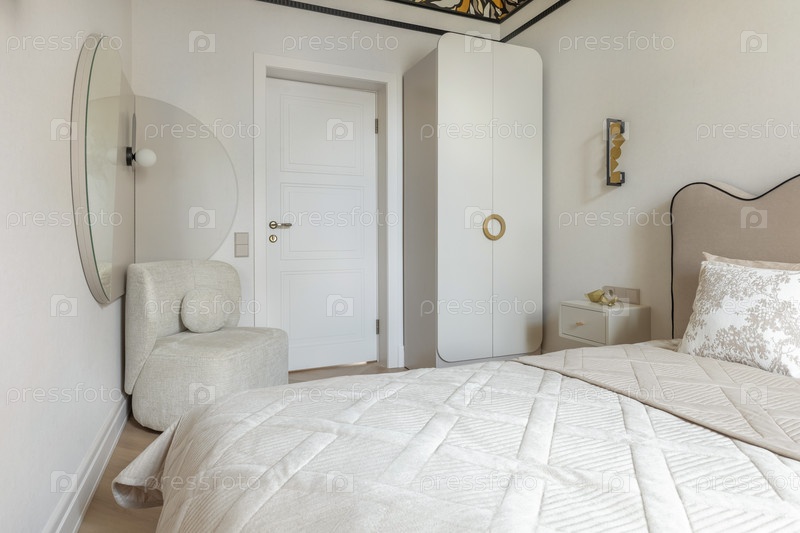 Стильные яркие спальни со текстурированным одеялом, компактным креслом, круглым зеркалом и гардеробом с золотыми акцентами возле минималистического ночного стола