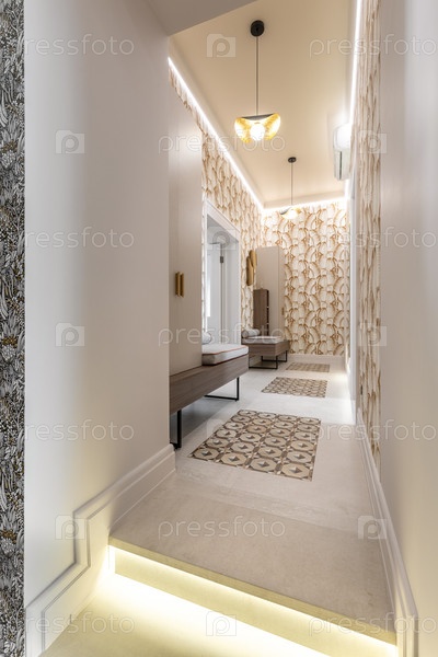 Стильный коридор с обоями и скамейками с узорами листьев