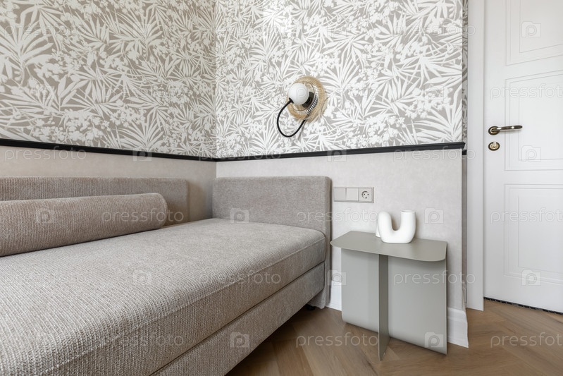 Спокойный, уютный внутренний уголок с минималистическим диваном, скульптурным дизайнерским столом и стильной лентой