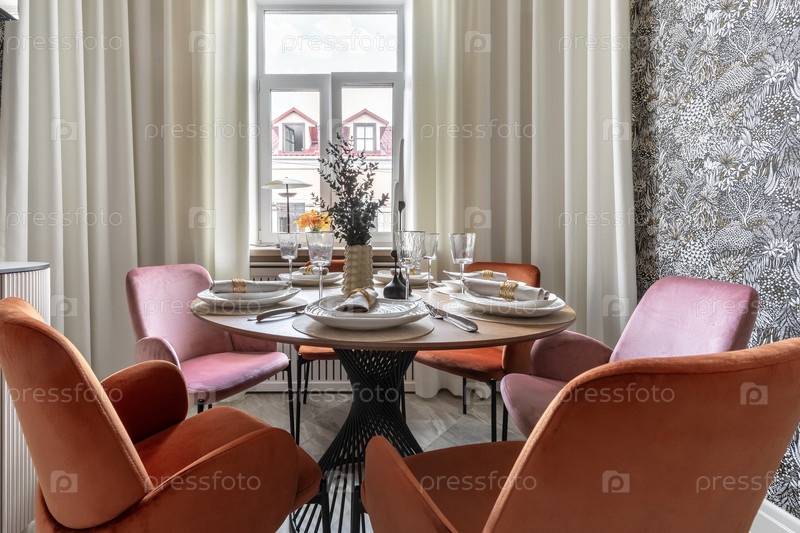 Элегантная столовая с бархатными стульями и столом