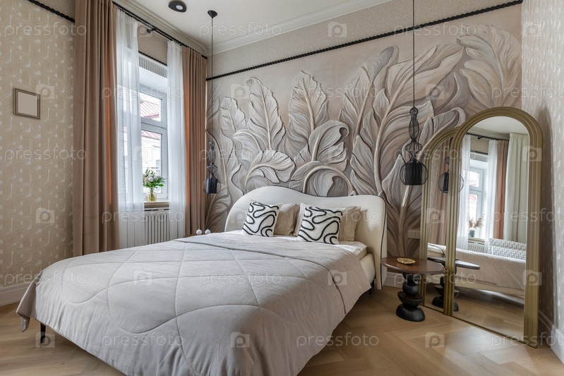 Уютный интерьер спальни с большой скульптурной ботанической картиной, мягким освещением, стильной кроватью, декоративными подушками и зеркалом на полу