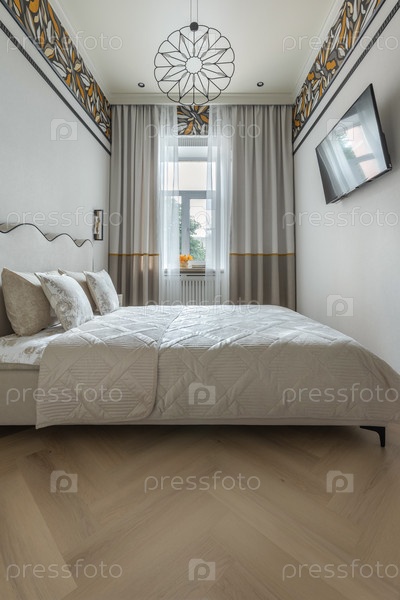 Стильный интерьер спальни с декоративной головкой, мягким постельным бельем, элегантными шторами и настенным телевизором при естественном дневном свете