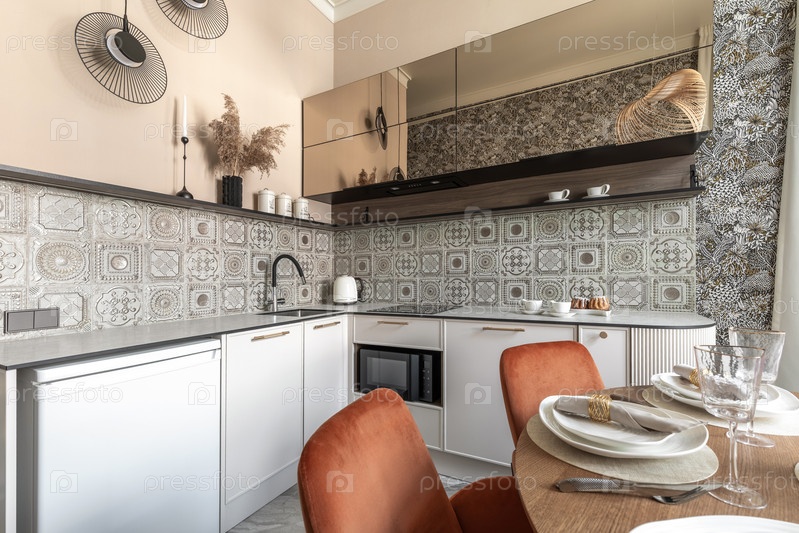 Уютный кухонный интерьер с декоративными плитками, белый гардероб, элегантное освещение и установленный обеденный стол с теплыми стульями