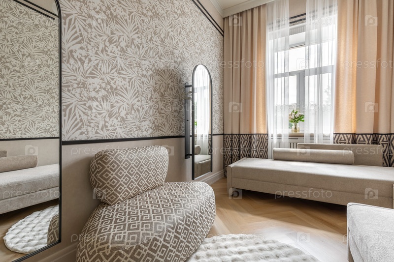 Современный скандинавский интерьер с мягким геометрическим стулом, большим окном, бежевыми шторами и стильными декоративными элементами