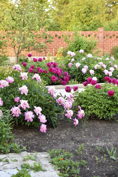 Бутоны пиона в летнем саду. цветы пиона красные и белые. цветение сада летом