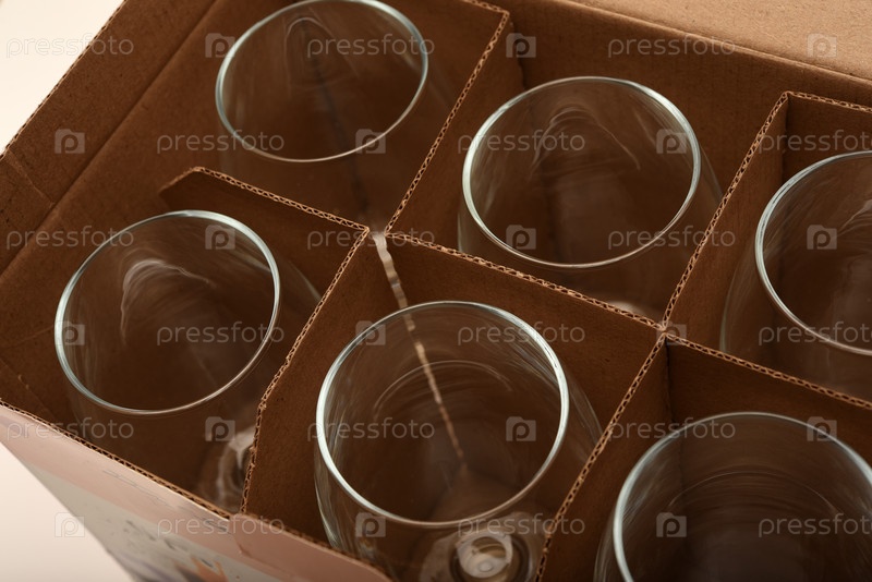 Пустые стеклянные бокалы в коробке