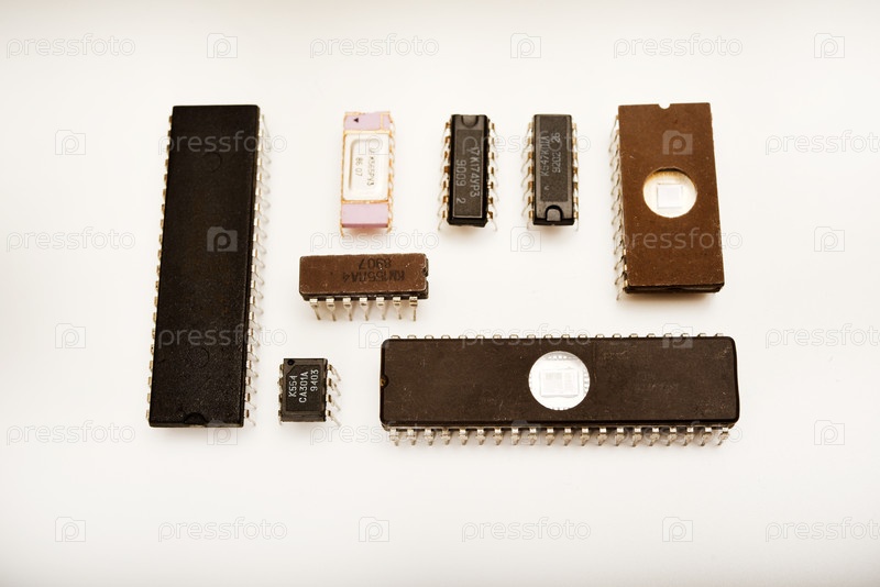 Несколько различных чипов на белом фоне.Старые электронные чипы