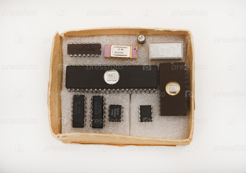 Несколько различных чипов на белом фоне.Старые электронные чипы