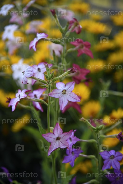Красочные цветы декоративного табака. Nicotiana Alata. Садовый табак. Рассеянность цветов в саду