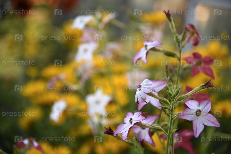 Красочные цветы декоративного табака. Nicotiana Alata. Садовый табак. Рассеянность цветов в саду