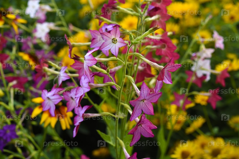 Красочные цветы декоративного табака. Nicotiana Alata. Садовый табак. Рассеянность цветов в саду