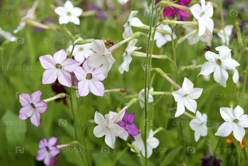 Красочные цветы декоративного табака. Nicotiana Alata. Садовый табак. Рассеянность цветов в саду