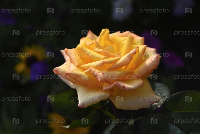 Красивый жёлто-розовый цветок розы на фоне размытых зеленых листьев. Роза в саду. Желто-розовый цвет