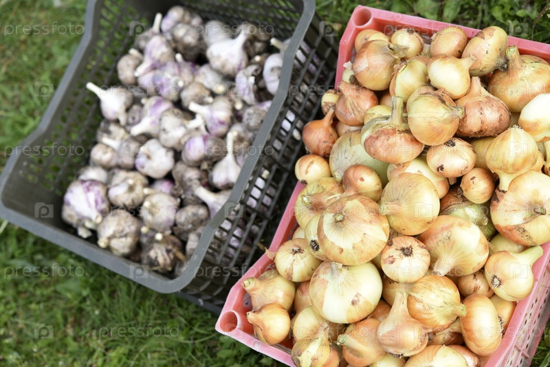 Корзины с луком и чесноком. Свежие луки и чеснок. Лук и чеснок для продажи в корзине