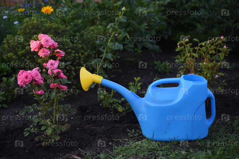 Голубой оросительный горшок для полива цветов в летнем саду.Поливные цветы в саду.Розы и ирригационные банки
