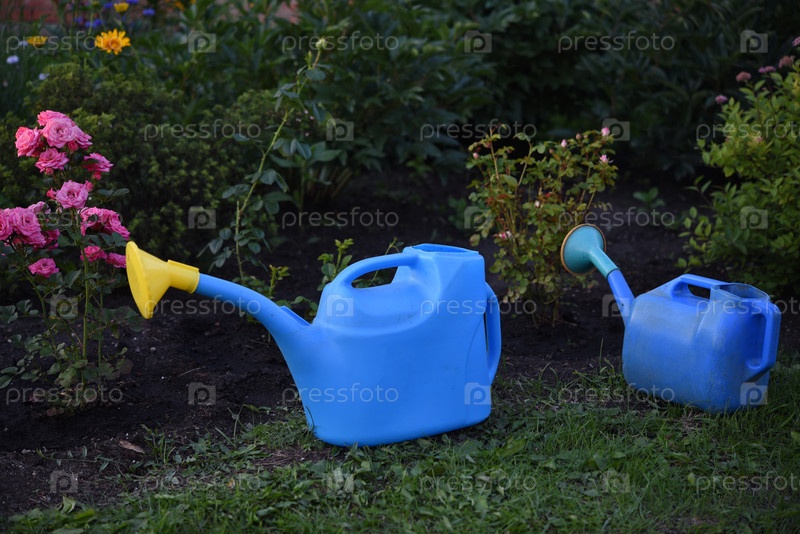 Голубые поливники для орошения цветов в летнем саду. Поливные цветы в саду. Розы и ирригационные банки