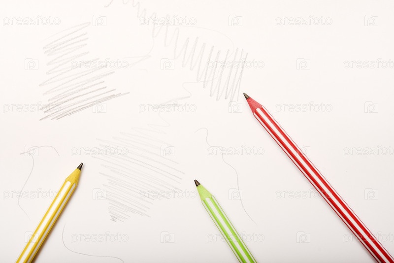 Три цветных карандаша и стиральная машина на белой бумаге