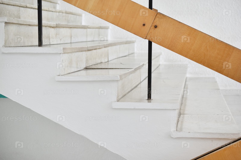 Лестница с мраморными ступеньками, белые стены и деревянные лестничные перила