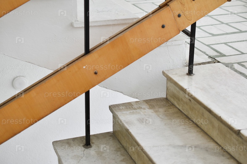 Лестница с мраморными ступеньками, белые стены и деревянные лестничные перила