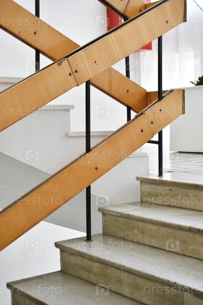 Лестница с мраморными ступеньками, белые стены и деревянные лестничные перила