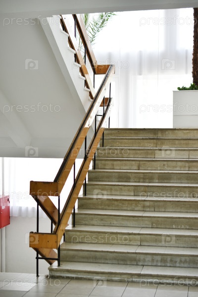 Лестница с мраморными ступеньками, белые стены и деревянные лестничные перила