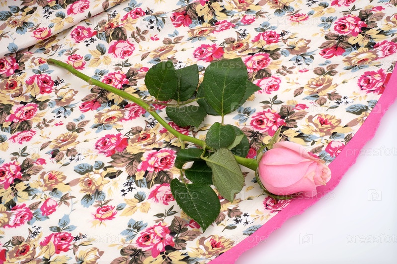 Розовая единственная роза на цветочной ткани, романтическая натюрмортная композиция