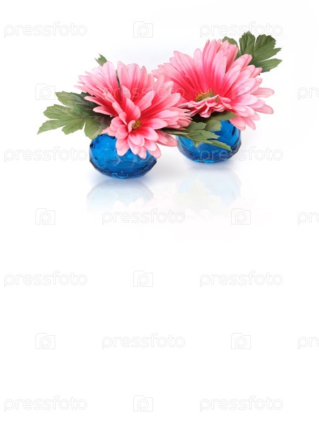 Цветок розовой герберы в небольшой голубой вазе, изолированной на белом фоне