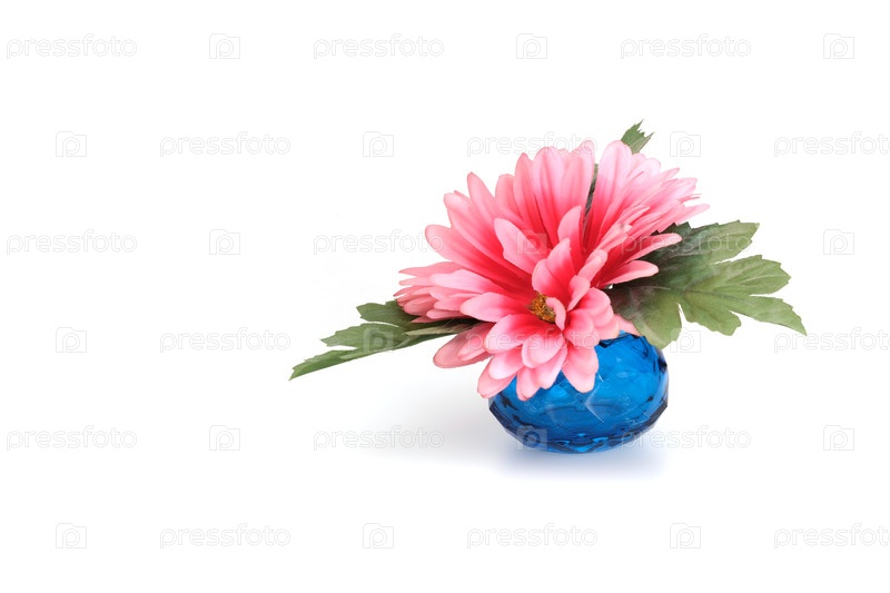 Цветок розовой герберы в небольшой голубой вазе, изолированной на белом фоне