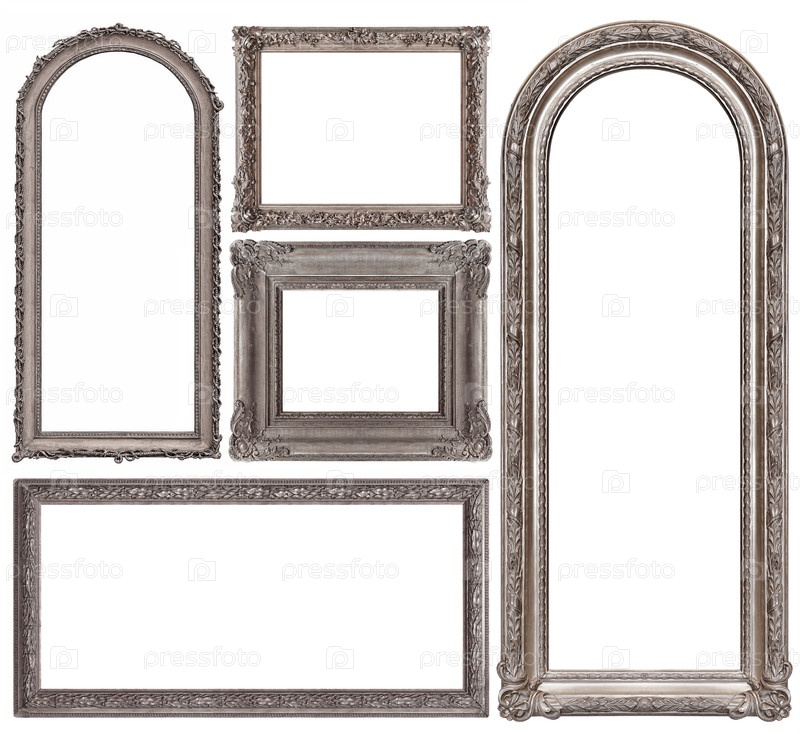 Набор серебряных рамок для картин, зеркал или фотографий, изолированных на белом фоне