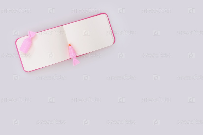 Композиция (мокап) с розовым блокнотом и розовым маркером, выделенным на белом фоне