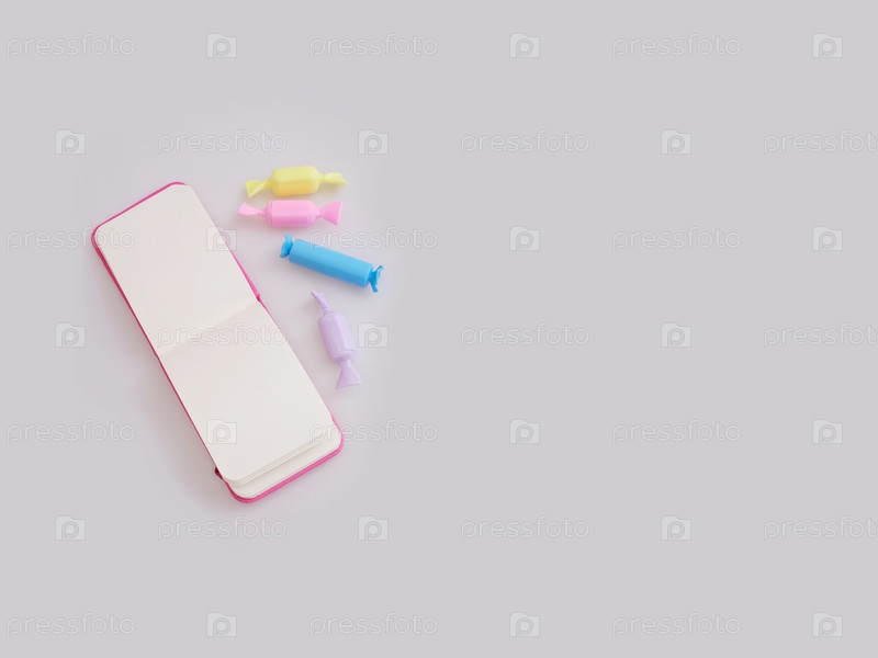 Композиция (мокап) с розовым блокнотом и многоцветными маркерами, подчеркнутыми на белом фоне
