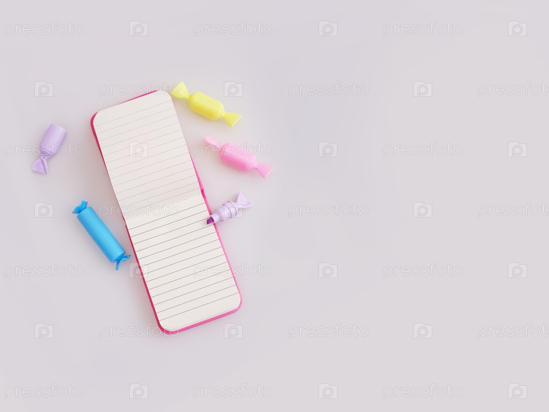 Композиция (мокап) с розовым блокнотом и многоцветными маркерами, подчеркнутыми на белом фоне