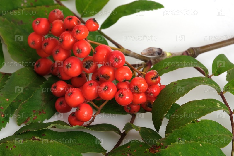 Ветка рована с ярко-красными ягодами и зелеными листьями изолирована на белом фоне для дизайна плаката или поздравительной открытки
