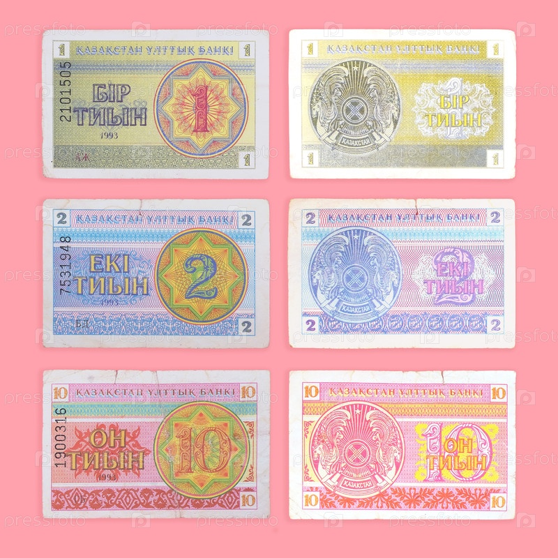 Казахские банкноты 1, 2 и 10 тинов выделены на розовом фоне