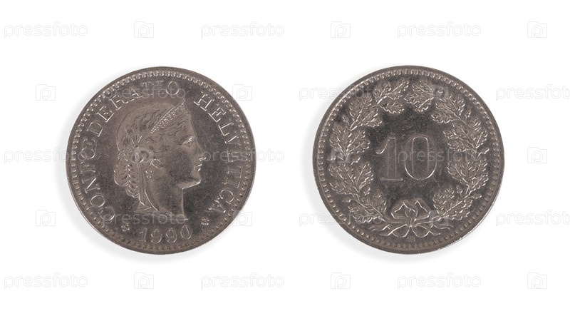 Швейцарская 10-сантиметровая монета выделена на белом фоне. Латинская надпись означает Швейцарская Конфедерация по-английски