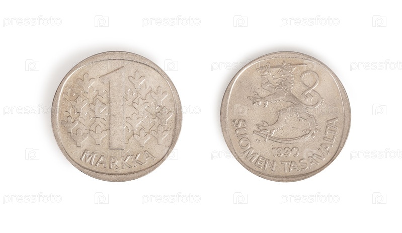 Старая финская монета 1 Финская марка (обратная и обратная) выделена на белом фоне