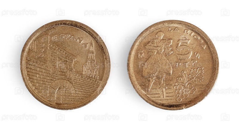 Монета 5 песес испанского происхождения. Испанская надпись означает 'Испания. 5 песес'. Риоха' на английском языке