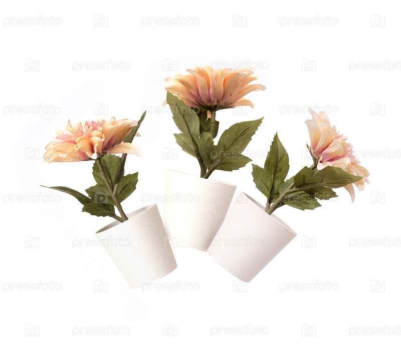 Розовые искусственные цветы в белых горшках, изолированных на белом фоне